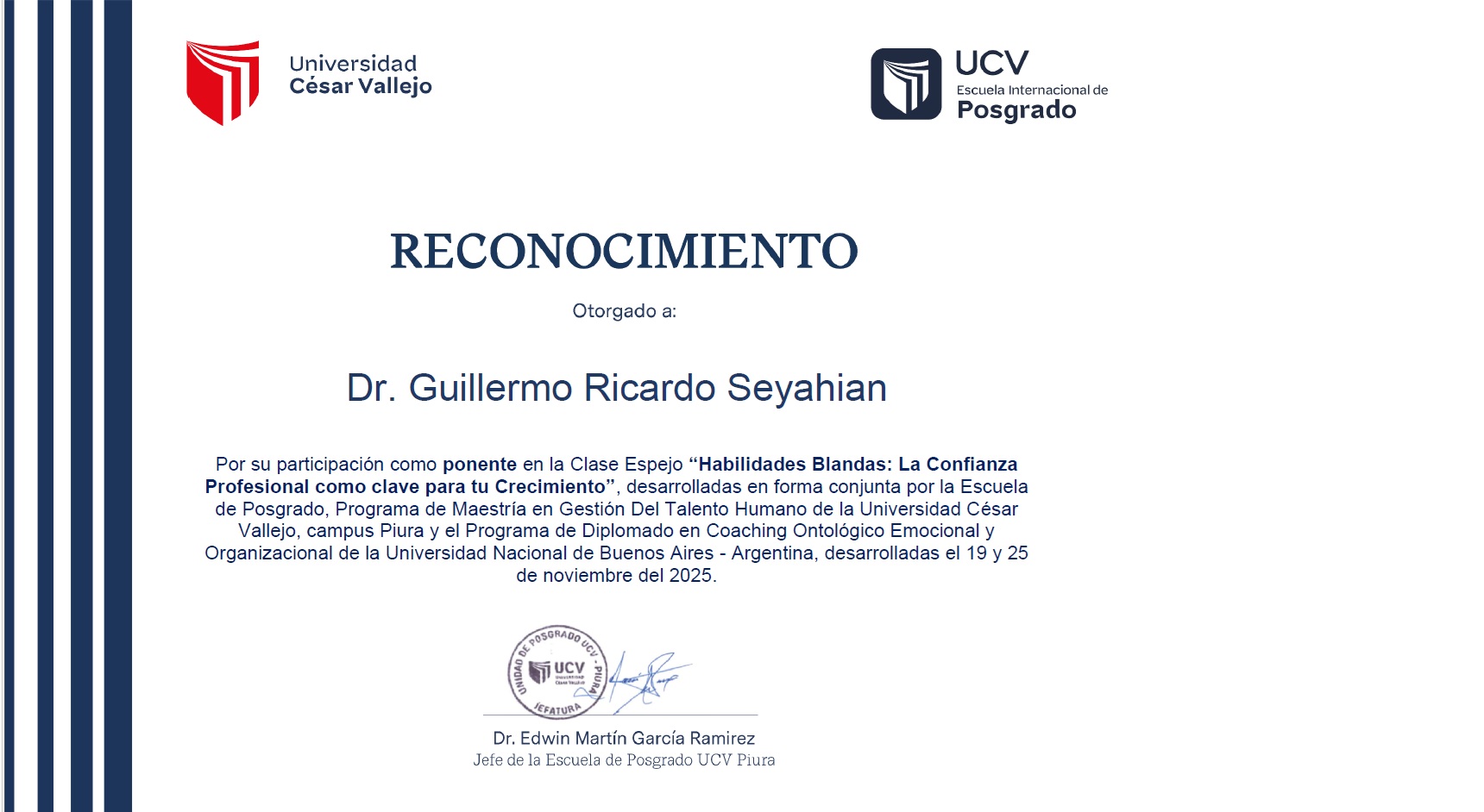 Agradezco el reconocimiento de la Unidad de Posgrado de la UCV; más que un certificado, representa el esfuerzo conjunto por internacionalizar el aprendizaje de nuestros alumnos. En tiempos de estandarización digital, el NeuroCoaching® aporta ese factor humano y científico que marca la diferencia en el desarrollo del talento.