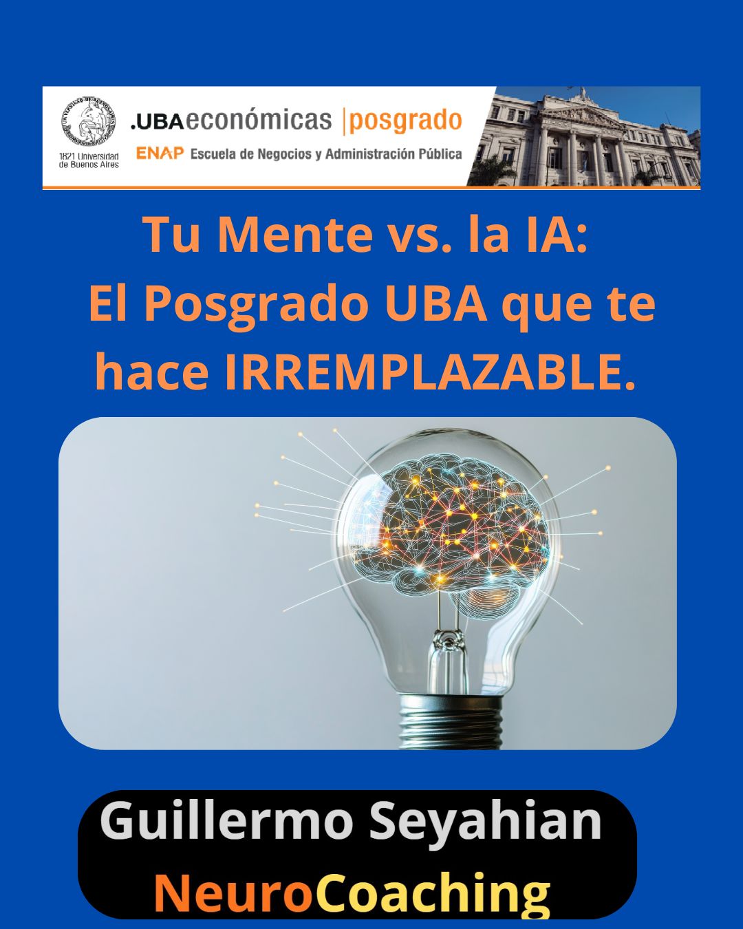 Como creador de NeuroCoaching® y docente en la FCE UBA desde 2010, sé que tu verdadera diferencia no está en tu título, sino en tus habilidades blandas. Por eso, te invito a una charla informativa gratuita sobre el Posgrado de Programación Neurolingüística en la FCE UBA, un espacio donde unimos Neurociencias, Emoción y Acción con estrategias exclusivas de NeuroCoaching®.